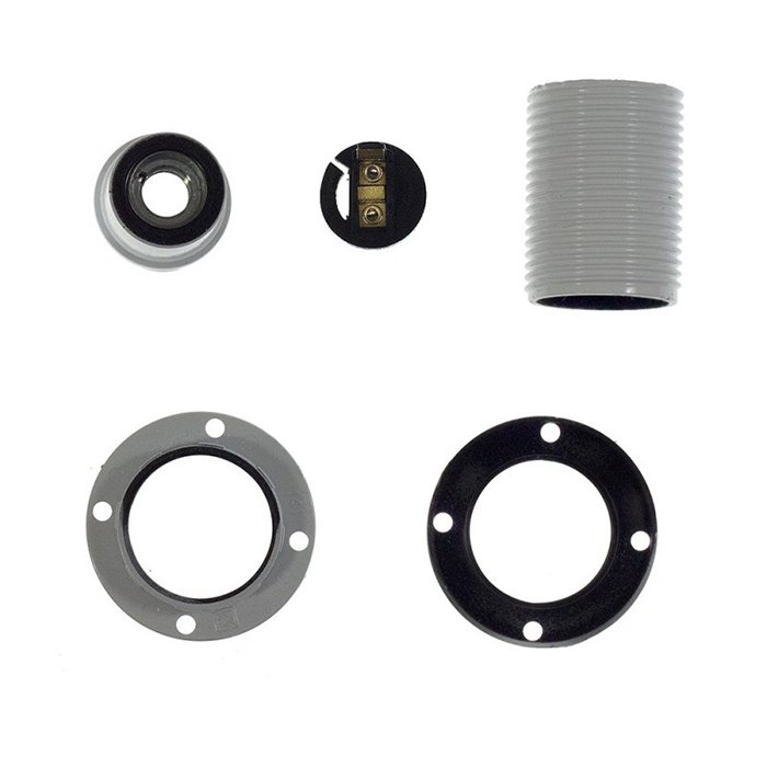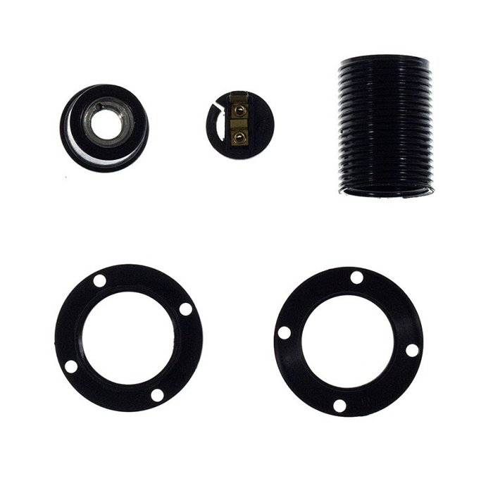 Bakelitová objímka pre žiarovku E14 Bakelini s možnosťou montáže tienidla je tvorená niekoľkými precízne spracovanými časťami, ktoré do seba presne zapadajú a vytvárajú kompaktný a funkčný celok. Konštrukčne sa skladá z vonkajšieho krytu (dekoratívneho plášťa) a vnútorného modulu s kontaktmi pre pripojenie prívodových vodičov: