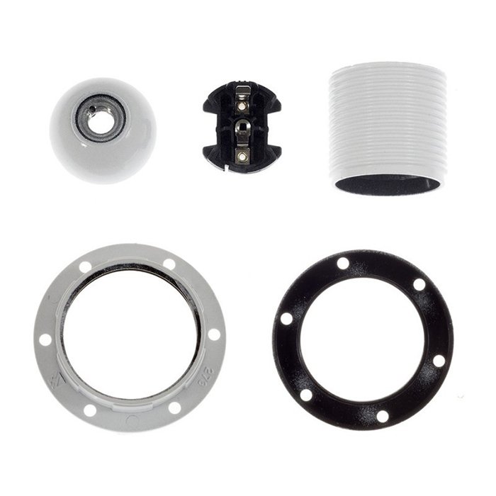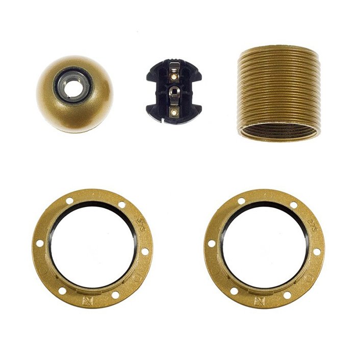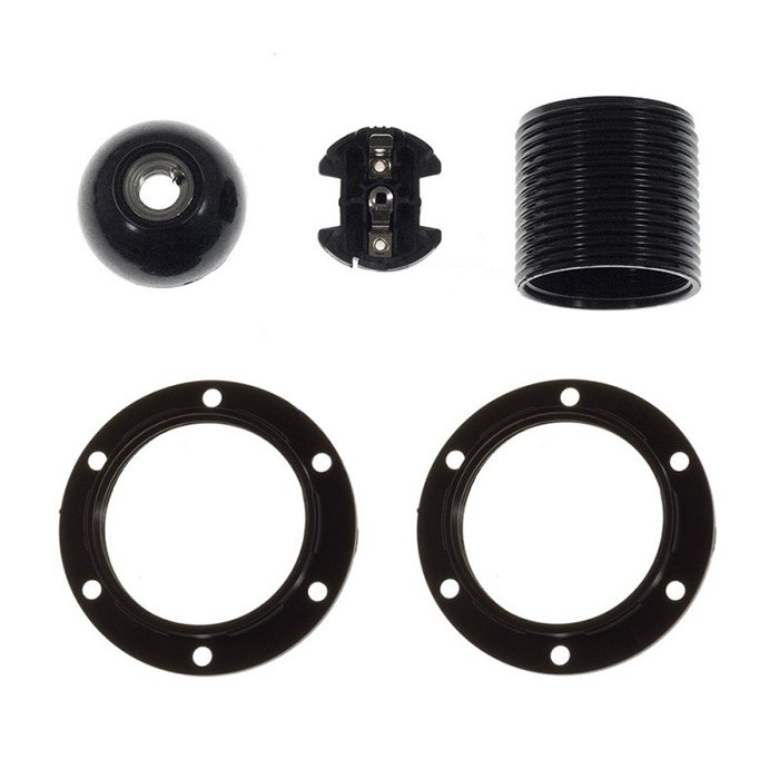 Bakelitová objímka pre žiarovku E27 Bakelina s možnosťou montáže tienidla je tvorená niekoľkými precízne spracovanými časťami, ktoré do seba presne zapadajú a vytvárajú kompaktný a funkčný celok. Konštrukčne sa skladá z vonkajšieho krytu (dekoratívneho plášťa) a vnútorného modulu s kontaktmi pre pripojenie prívodových vodičov: