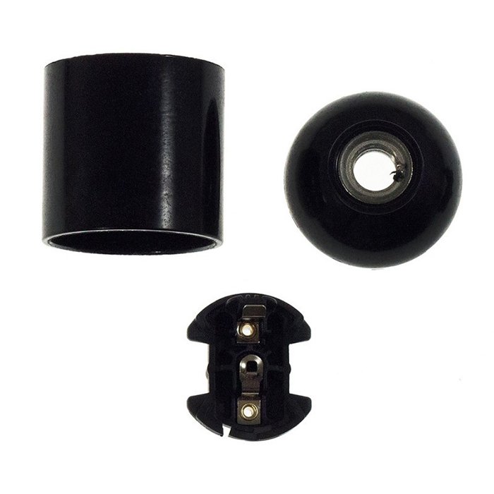 Bakelitová objímka pre žiarovku E27 Bakelna je tvorená niekoľkými precízne spracovanými časťami, ktoré do seba presne zapadajú a vytvárajú kompaktný a funkčný celok. Konštrukčne sa skladá z vonkajšieho krytu (dekoratívneho plášťa) a vnútorného modulu s kontaktmi pre pripojenie prívodových vodičov: