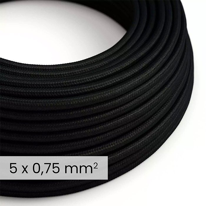 Čierny textilný kábel 5x0,75 mm s produktovým označením RayonGloss RM04 je určený pre pevné inštalácie v elektrických sieťach 230 V. Vhodný je hlavne pre dekoratívne interiérové svietidlá alebo svetelné sústavy, kde vynikne jeho farebná stálosť, precízne zhotovenie a rozšírené možnosti zapojenia piatich vodičov. Tie umožňujú využitie káblu pre DALI riadenie, RGBW svetelné systémy či inštalácie s požiadavkou na komplexnejšie ovládanie a signalizáciu v rámci jedného vedenia. Vďaka medeným lankovým vodičom v guľatom prevedení, dvojitej PVC izolácii a precíznemu spracovaniu ponúka kábel vysokú mieru bezpečnosti, flexibilitu a nadštandardnú mechanickú odolnosť s nosnosťou káblu pre závesné svietidlá až 6,75 kg. Povrch z jemné Rayon (umelý hodváb) textília dodáva káblu mimoriadny vzhľad, vďaka ktorému sa stáva nie len funkčným, ale aj estetickým prvkom interiéru. Využite 5x0,75 mm čierny textilný kábel RM04 pre individuálnu či malosériovú výrobu originálnych svietidiel či osvetľovacích sústav s dôrazom na design a detail.