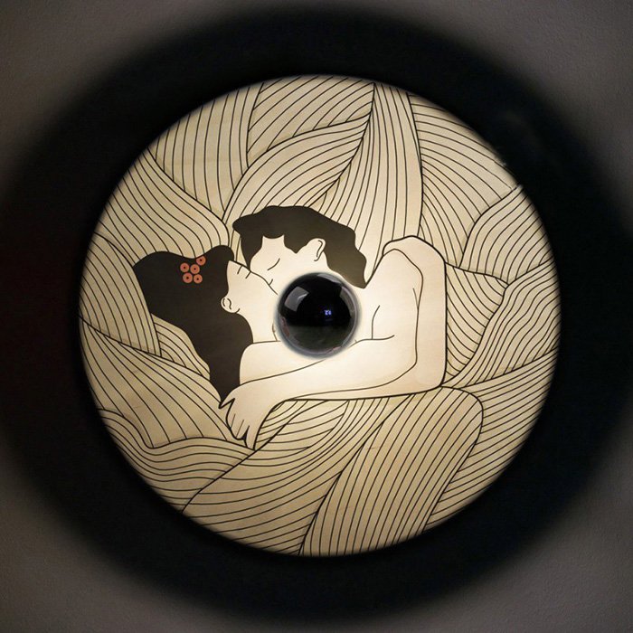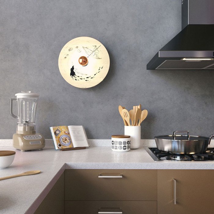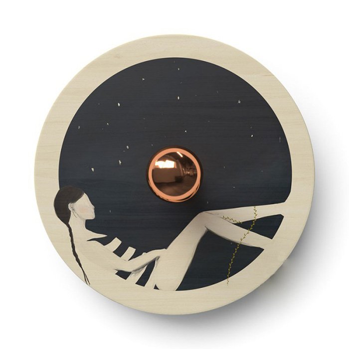 Naša dekoratívna lampa Fermaluce Romantic je fantasticky hravým prvkom interiérového dizajnu. Využijete ju predovšetkým ako nástenné osvetlenie, prípadne aj ako stropné svietidlo. Tienidlo v tvare UFO dekoratívnej lampičky je obojstranne ilustrované motívom Romantic. Samotné tienidlo lampy je vyrobené z topoľového dreva a má priemer 33cm. Dizajn tienidla vznikol počas výstavy FuoriSalone a Milan design Week 2018. Kde sa na jeho stvárnení podieľali najsľubnejšie mená Talianskej ilustrácie. Z každej strany tienidla nájdete iný vzor, ktorý môžete kedykoľvek podľa nálady použiť.