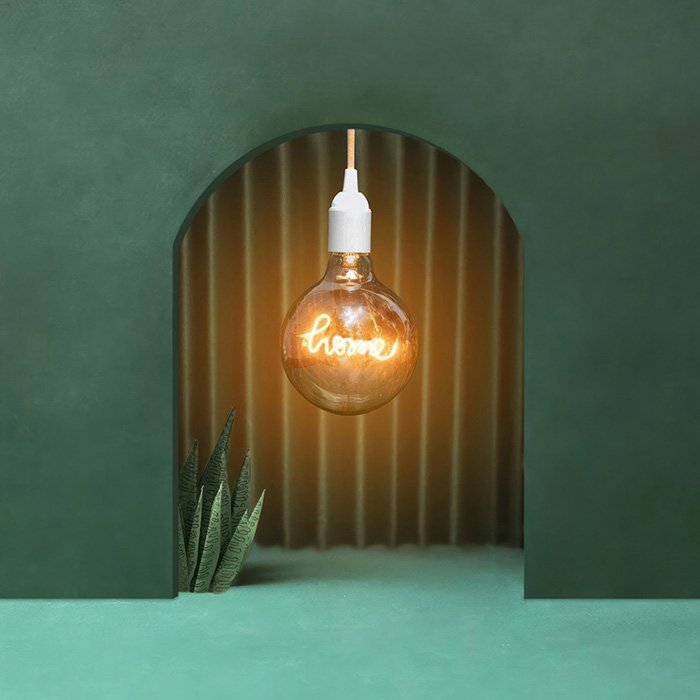 Stmievateľná HOME žiarovka so závitom E27 s produktovým označením Deco Up Gold s príkonom 5W je dekoratívny a energeticky efektívny svetelný zdroj. Vzhľadom k obľúbenému tvaru jantárovej sklenenej banky G125 (Globe - v najširšej časti Ø 125mm) je skvelou alternatívou do všetkých závesných svietidiel s objímkou E27. To čo robí žiarovku Deco Up Gold mimoriadnym prvkom svetelnej dekorácie je tvarovanie svetelného vlákna do HOME nápisu. Pri rozsvietení žiarovky sa prejavia aj výhody jantárového sfarbenia skla. Vyžarované svetlo preniká do priestoru žltkastým teplým tónom svetla. Stmievacia HOME žiarovka G125 produkuje scénické alebo harmonické osvetlenie charakteristiky:
