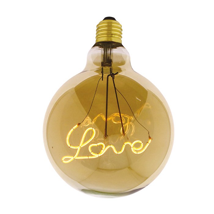 Stmievateľná LOVE žiarovka so závitom E27 s produktovým označením Deco Up Gold s príkonom 5W je dekoratívny a energeticky efektívny svetelný zdroj. Vzhľadom k obľúbenému tvaru jantárovej sklenenej banky G125 (Globe - v najširšej časti Ø 125mm) je skvelou alternatívou do všetkých závesných svietidiel s objímkou E27. To čo robí žiarovku Deco Up Gold mimoriadnym prvkom osvetlenej dekorácie je tvarovanie svetelného vlákna do romantického LOVE nápisu. Pri rozsvietení žiarovky sa prejavia aj výhody jantárového sfarbenia skla. Vyžarované svetlo preniká do priestoru žltkastým teplým tónom svetla. Stmievacia LOVE žiarovka G125 produkuje scénické alebo harmonické osvetlenie charakteristiky: