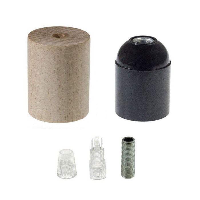 Drevená objímka pre žiarovku E27 Woodhool je tvorená niekoľkými precízne spracovanými časťami, ktoré do seba presne zapadajú a vytvárajú kompaktný a funkčný celok. Konštrukčne sa skladá z vonkajšieho krytu (dekoratívneho plášťa) a vlastnej funkčnej objímky určenej k uchyteniu žiarovky: