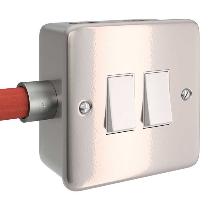 Kovový povrchový dvojvypínač ponúka flexibilné a praktické riešenie vhodné na pripojenie kompatibilnej #tablink#creative-tube#elektroinštalačnej trubice## zo všetkých 4 strán pomocou priechodky M20, ktorú nájdete v #tablink#nezapomente#montážnom príslušenstve##. Vďaka robustnému prevedeniu je dvojvypínač odolnou a spoľahlivou voľbou ako pre rezidenčné, tak aj komerčné priestory.Technicky je možné popísať dvojvypínač popísať ako: