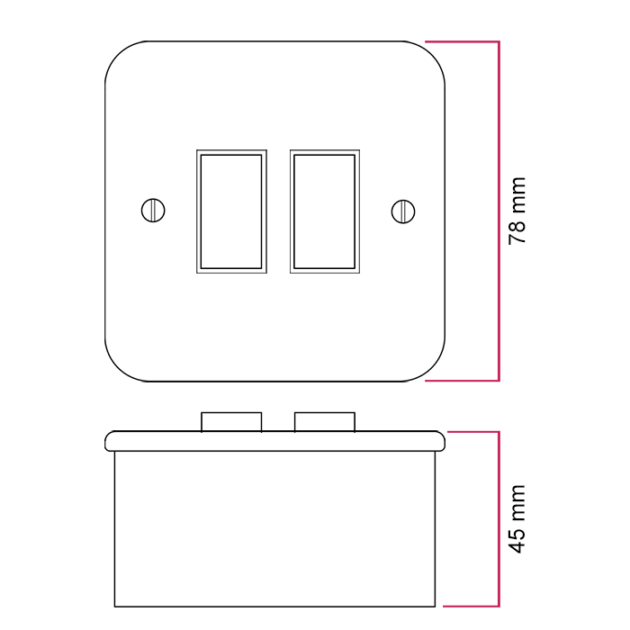 Povrchový dvojvypínač na stenu je vyrobený z kovu. Je robustný, preto ho môžete využiť ako v rezidenčných, tak predovšetkým komerčných projektoch. Ponúkaný je farebnom prevedení: