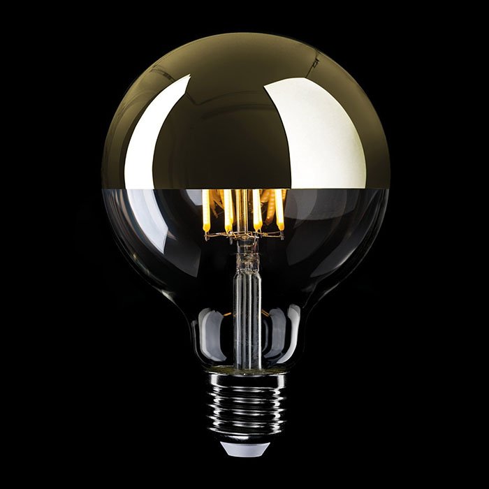 Číra sklenená banka zaisťuje jasný a intenzívny svetelný tok, zatiaľ čo zlatý vrchlík odráža časť svetla späť do svietidla. Tým znižuje oslnenie a smeruje svetlo prevažne dole. Zrkadlový povrch dodáva žiarovke elegantný, moderný vzhľad a luxusný charakter. Tento dizajn zaisťuje príjemné a funkčné osvetlenie charakteristiky: