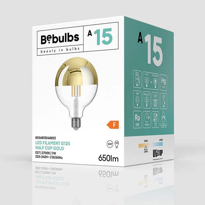 Stmievateľná LED žiarovka so zlatým zrkadlovým vrchlíkom BeBulbs-AG a závitom E27 je špeciálny typ dekoratívneho svetelného zdroja, ktorý kombinuje funkčnosť s estetickým efektom. Dominantný tvar pripomínajúci glóbus G125 (Drop - v najširšej časti Ø 125mm) dokonale ladí s bežnými svietidlami a spája klasický dizajn s modernou LED technológiou. Precízne technické spracovanie spolu s renomovanou kvalitou značky BeBulbs garantuje špičkové svetelné vlastnosti, vysokú účinnosť a maximálnu spokojnosť pri každodennom používaní.