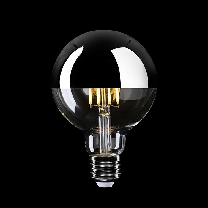 Číra sklenená banka zaisťuje jasný a intenzívny svetelný tok, zatiaľ čo strieborný vrchlík odráža časť svetla späť do svietidla. Tým znižuje oslnenie a smeruje svetlo prevažne dole. Zrkadlový povrch dodáva žiarovke elegantný, moderný vzhľad a luxusný charakter. Tento dizajn zaisťuje príjemné a funkčné osvetlenie charakteristiky: