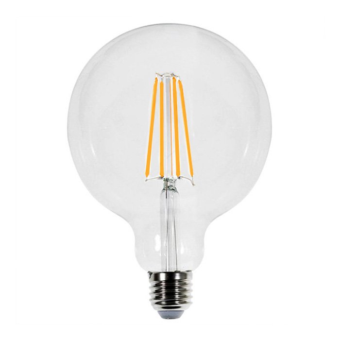 Filamentová žiarovka E27 závitu s príkonom 6W je kvalitný a energeticky efektívny svetelný zdroj. Vzhľadom k obľúbenému tvaru čírej sklenenej banky G125 (Globe - v najširšej časti Ø 125mm) je skvelou alternatívou do všetkých závesných svietidiel s objímkou E27. Pri rozsvietení filament žiarovky sa prejavia výhody číreho zafarbenia skla. Produkované svetlo je rovnomerne rozptýlené po celej ploche žiarovky. Vyžarované svetlo preniká do priestoru úplne bez difúzie. LED filament žiarovka G125 s lineárne uloženými vláknami 3x COBL produkuje osvetlenie s charakteristikami: