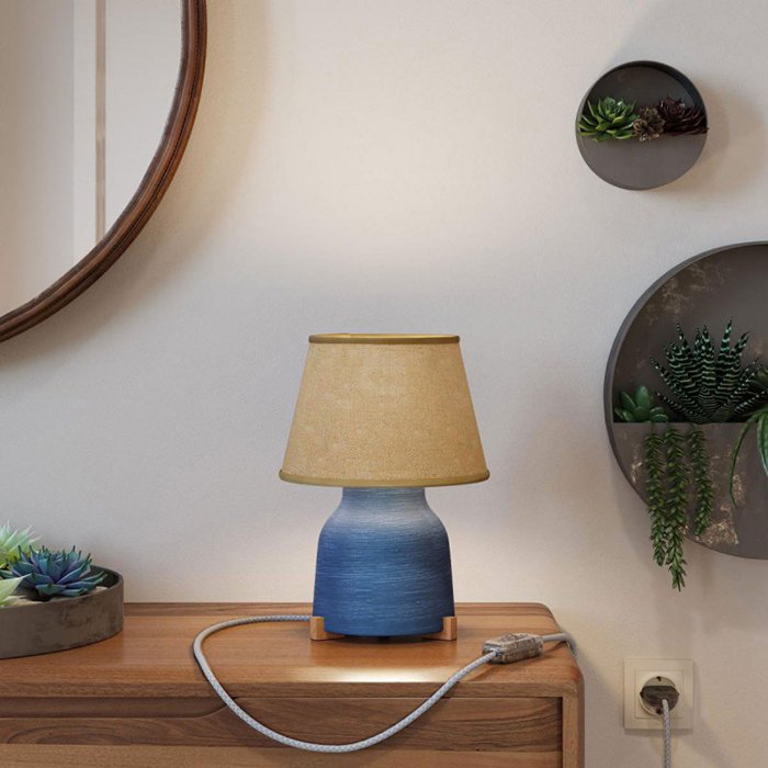- lampa: modrá štruktúrovaná | tienidlo: prírodná juta | vo variante so žiarovkou: [CBL700117]: LED, A60, 7W, 806 Lm, 2700 K, E27, stmievateľná