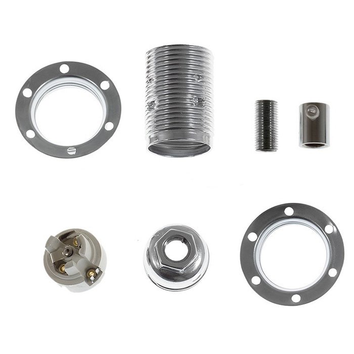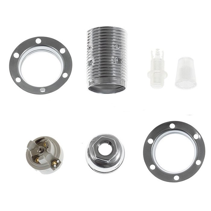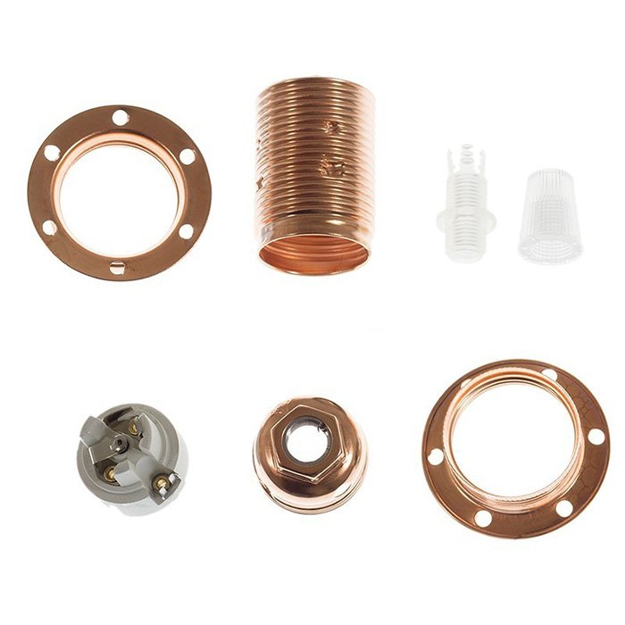 Kovová retro objímka pre žiarovku E14 s možnosťou montáže tienidla Metalnuti je tvorená niekoľkými precízne spracovanými časťami, ktoré do seba presne zapadajú a vytvárajú kompaktný a funkčný celok. Konštrukčne sa skladá z vonkajšieho krytu (dekoratívneho plášťa) a vlastnej funkčnej objímky určenej k uchyteniu žiarovky: