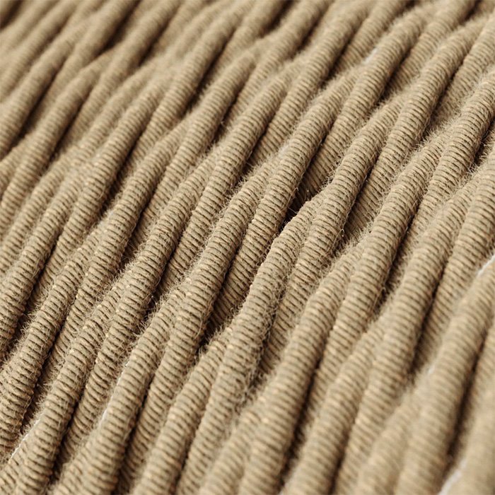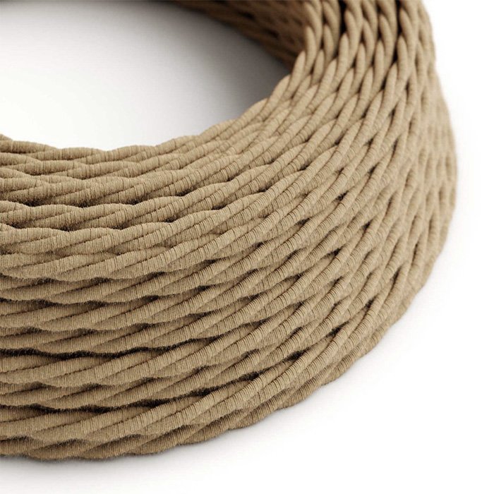 Materiál pre béžový kábel so skrútenými vodičmi je juta. Jutový oplet skrúteného elektrického kábla kombinuje krásu tejto tradičnej tkaniny s novým výrobným procesom, ktorý ešte viac zvýrazní jej charakter a prirodzený vzhľad. Juta dodáva krútenému káblu matný povrch s jemnou burráciou, ktorá je typická napríklad pre lano alebo pre povraz. Jutový krútený kábel je veľmi vhodný pre rustikálny, vintage alebo retro dizajn, má schopnosť vytvoriť domáce a útulné prostredie. Krútenie jednotlivých drôtov do špirály dáva béžovému bavlnenému textilnému káblu mimoriadny vzhľad a pôsobivý efekt. Jutový kábel skrútený typ RN06 osloví všetky tvorivé duše, pretože jednoducho priťahuje pozornosť.