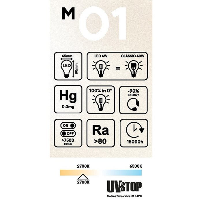 Opálová žiarovka so závitom E27, s mliečnym sklom tvaru G45 a príkonom 4W je moderné vydanie pre klasické a v minulosti používané žiarovky. Svojím plným okrúhlym tvarom sklenenej banky G45 (Globetta - v najširšej časti Ø 45mm) je skvelou alternatívou do všetkých bežných svietidiel s objímkou E27. Mliečne sfarbenie skla žiarovky znižuje mieru oslnenia, je mimoriadne estetické a ponúka pri rozsvietení pohodové upokojujúce osvetlenie s difúziou svetla charakteristiky: