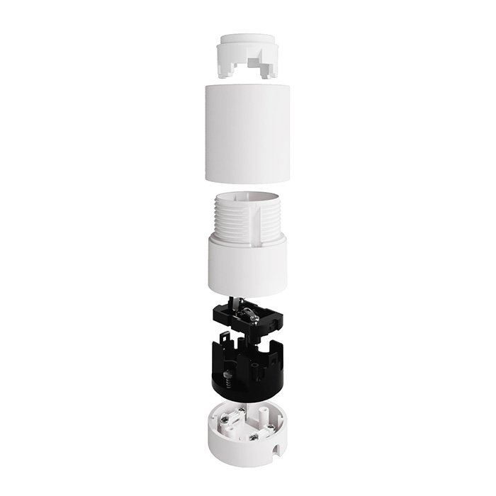 Plastová priechodná objímka pre žiarovku E27 s prisadenou montážou T-Plasticap je tvorená niekoľkými precízne spracovanými časťami, ktoré do seba presne zapadajú a vytvárajú kompaktný a funkčný celok. Konštrukčne sa skladá z vonkajšieho krytu (dekoratívneho plášťa) a vlastnej funkčnej objímky určenej k uchyteniu žiarovky: