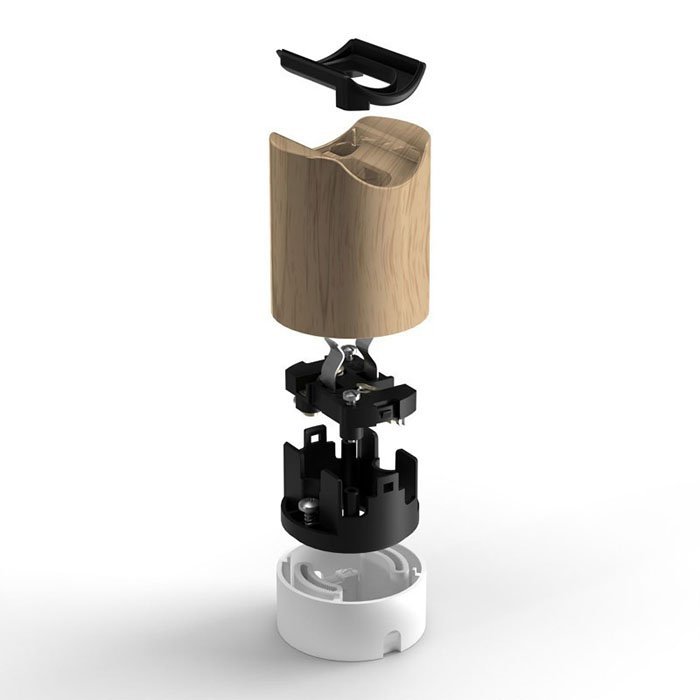 Plastová priechodná objímka pre žiarovku S14D s prisadenou montážou T-Plastiess je tvorená niekoľkými precízne spracovanými časťami, ktoré do seba presne zapadajú a vytvárajú kompaktný a funkčný celok. Konštrukčne sa skladá z vonkajšieho krytu (dekoratívneho plášťa) a vlastnej funkčnej objímky určenej k uchyteniu žiarovky: