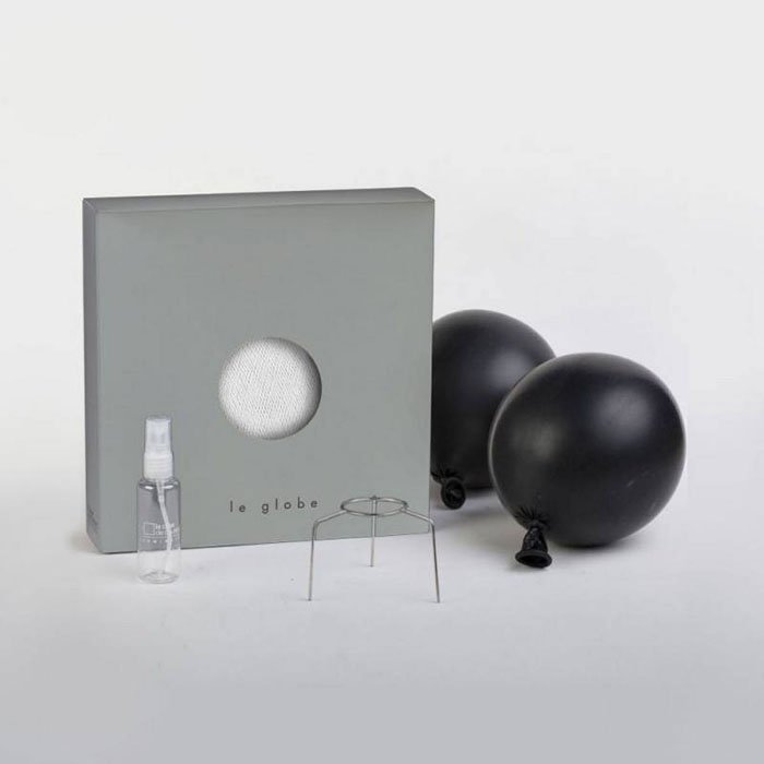 Textilné tienidlo v tvare gule Globe obdržíte v elegantnom balení spolu s návodom na použitie. Nebojte sa, je to ľahké a zábavné: všetko, čo musíte urobiť, je vyplniť tienidlo priloženým balónikom, postriekať vodou a nechať zatuhnúť a vytvrdiť. Môžete sa tiež inšpirovať naším #tablink#videa#inštruktážnym videom##.