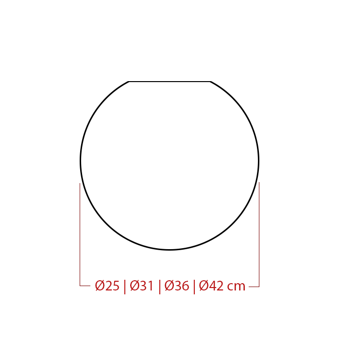 - Priemer podľa veľkosti: XS Ø25cm, S Ø31cm, M Ø36cm, L Ø42cm
