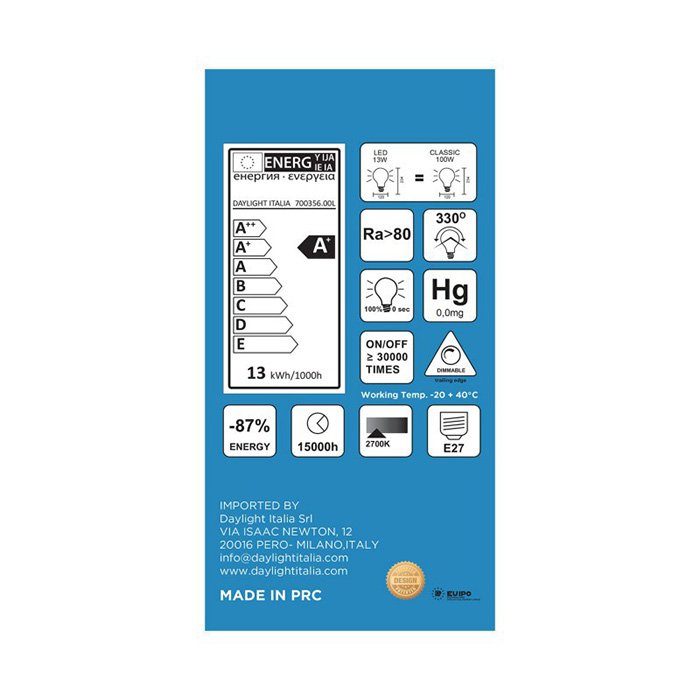Kvalitu, efektivitu prevádzky a dlhú životnosť vyše 15 000 hodín garantuje svetovo rešpektovaný výrobca žiaroviek DayLight Italia. Precízne technické spracovanie so zameraním na každý detail LED veľkej žiarovky Caramella je to, čím táto spoločnosť dosiahla významný podiel na trhu svetelných zdrojov. Vzhľadovo atraktívna a kvalitná stmievateľná veľká žiarovka s technickými vlastnosťami ako: IC Driver Design a COB LED čip, (Ra)CRI90 dokáže v mnohých prípadoch ospravedlniť vyššie obstarávacie náklady.
