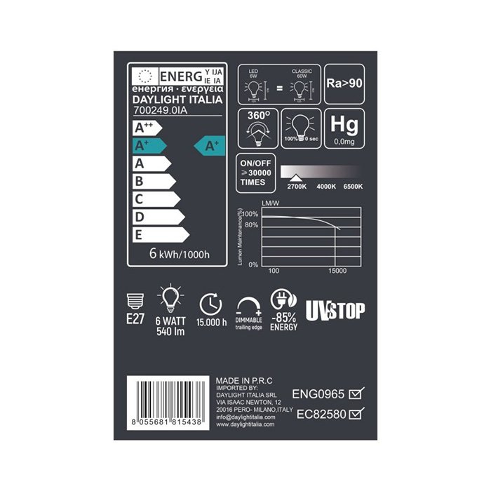 Kvalitu, efektivitu prevádzky a dlhú životnosť cez 15 000 hodín garantuje svetovo rešpektovaný výrobca žiaroviek DayLight Italia. Precízne technické spracovanie so zameraním na každý detail vintage žiarovky je to, čím táto spoločnosť dosiahla významný podiel na trhu svetových svetelných zdrojov. Vzhľadovo atraktívna a kvalitná stmievateľná vintage žiarovka s technickými vlastnosťami, ako: IC Driver Design a COB LED chip, (Ra) CRI90 dokáže v mnoho prípadoch ospravedlniť vyššie nákupné náklady.