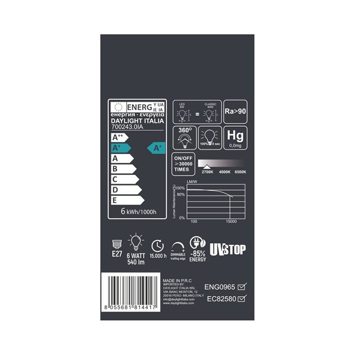 Kvalitu, efektivitu prevádzky a dlhú životnosť viac ako 15 000 hodín garantuje svetovo rešpektovaný výrobca žiaroviek DayLight Italia. Precízne technické spracovanie so zameraním na každý detail mliečnej žiarovky s porcelánovým efektom je to, čím táto spoločnosť dosiahla významný podiel na trhu svetelných zdrojov.Kvalitná stmievateľná žiarovka s technickými vlastnosťami ako: No Flickering, IC Driver Design a COB LED chip, (Ra) CRI90 dokáže v mnohých prípadoch ospravedlniť vyššie obstarávacie náklady.