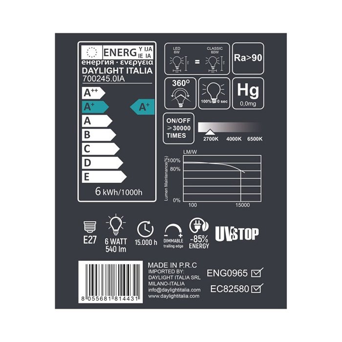 Kvalitu, efektivitu prevádzky a dlhú životnosť cez 15 000 hodín garantuje svetovo rešpektovaný výrobca žiaroviek DayLight Italia. Precízne technické spracovanie so zameraním na každý detail mliečnej žiarovky s porcelánovým efektom je to, čím táto spoločnosť dosiahla významný podiel na trhu svetelných zdrojov. Vzhľadovo atraktívna a kvalitná stmievateľná žiarovka s technickými vlastnosťami ako: No Flickering, IC Driver Design a COB LED čip, (Ra) CRI90 dokáže v mnohých prípadoch ospravedlniť vyššie obstarávacie náklady.