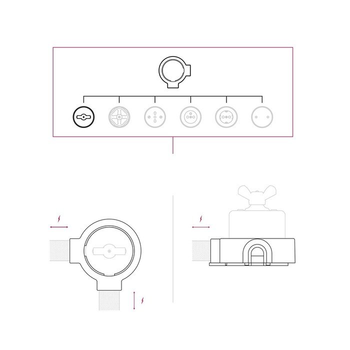 Porcelánová základňa vypínača P-Nut-Base (alebo ak chcete inštalačný porcelánový rámček) slúži ako praktický montážny prvok, ktorý výrazne uľahčuje prepojenie prívodných káblov zo štyroch rôznych smerov (v závislosti na zvolenej produktovej variante). Vďaka svojmu šikovnému konštrukčnému riešeniu umožňuje elegantné vedenie kabeláže, pričom všetko spojenie zostáva diskrétne a bezpečne ukryté vo vnútri tela základne.