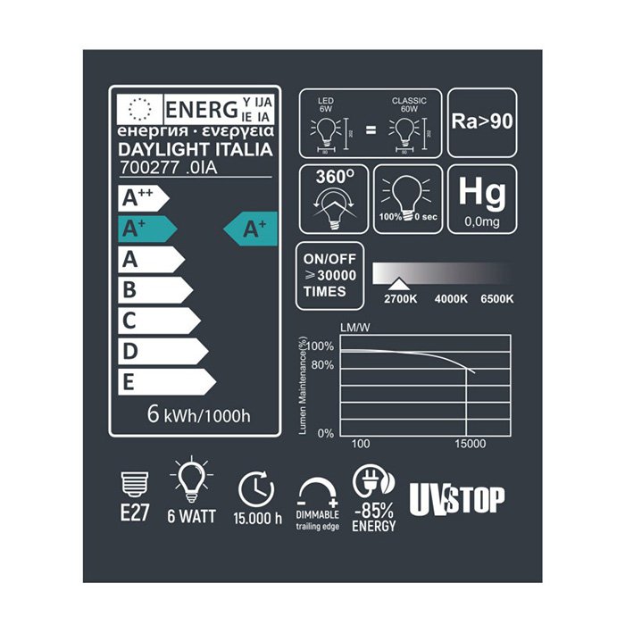 Kvalitu, efektivitu prevádzky a dlhú životnosť vyše 15 000 hodín garantuje svetovo rešpektovaný výrobca žiaroviek DayLight Italia. Precízne technické spracovanie so zameraním na každý detail LED retro žiarovky s efektom brúseného krištáľu Demetra je to, čím táto spoločnosť dosiahla významný podiel na trhu svetelných zdrojov. Vzhľadovo atraktívna a kvalitná stmievateľná žiarovka s technickými vlastnosťami ako: IC Driver Design a COB LED čip, (Ra)CRI90 dokáže v mnohých prípadoch ospravedlniť vyššie obstarávacie náklady.