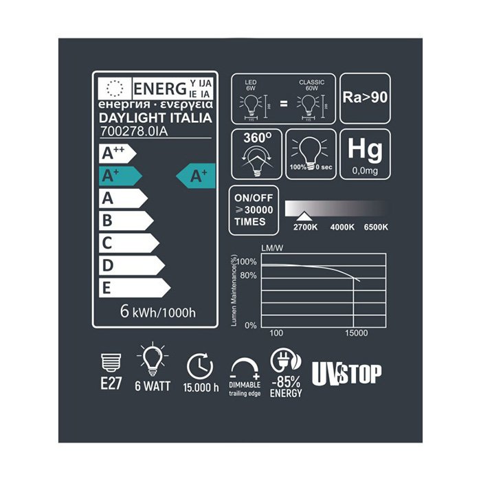 Kvalitu, efektivitu prevádzky a dlhú životnosť vyše 15 000 hodín garantuje svetovo rešpektovaný výrobca žiaroviek DayLight Italia. Precízne technické spracovanie so zameraním na každý detail LED retro žiarovky s efektom brúseného krištáľu Eos je to, čím táto spoločnosť dosiahla významný podiel na trhu svetelných zdrojov. Vzhľadovo atraktívna a kvalitná stmievateľná žiarovka s technickými vlastnosťami ako: IC Driver Design a COB LED čip, (Ra)CRI90 dokáže v mnohých prípadoch ospravedlniť vyššie obstarávacie náklady.