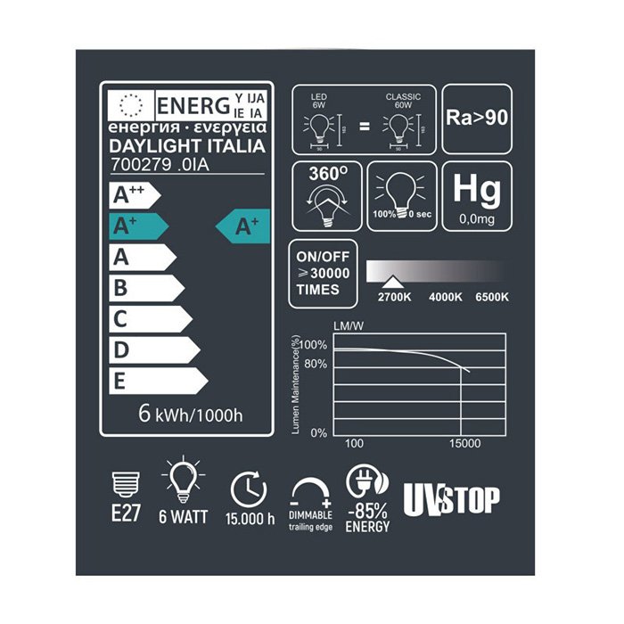 Kvalitu, efektivitu prevádzky a dlhú životnosť vyše 15 000 hodín garantuje svetovo rešpektovaný výrobca žiaroviek DayLight Italia. Precízne technické spracovanie so zameraním na každý detail LED retro žiarovky s efektom brúseného krištáľu je to, čím táto spoločnosť dosiahla významný podiel na trhu svetelných zdrojov. Vzhľadovo atraktívna a kvalitná stmievateľná žiarovka s technickými vlastnosťami ako: IC Driver Design a COB LED čip, (Ra)CRI90 dokáže v mnohých prípadoch ospravedlniť vyššie obstarávacie náklady.