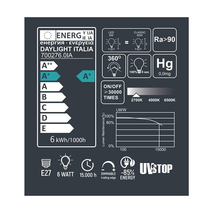 Kvalitu, efektivitu prevádzky a dlhú životnosť vyše 15 000 hodín garantuje svetovo rešpektovaný výrobca žiaroviek DayLight Italia. Precízne technické spracovanie so zameraním na každý detail LED retro žiarovky s efektom brúseného krištáľu Iris je to, čím táto spoločnosť dosiahla významný podiel na trhu svetelných zdrojov. Vzhľadovo atraktívna a kvalitná stmievateľná žiarovka s technickými vlastnosťami ako: IC Driver Design a COB LED čip, (Ra)CRI90 dokáže v mnohých prípadoch ospravedlniť vyššie obstarávacie náklady.