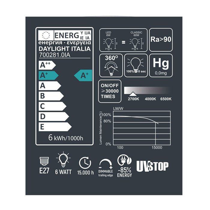 Kvalitu, efektivitu prevádzky a dlhú životnosť vyše 15 000 hodín garantuje svetovo rešpektovaný výrobca žiaroviek DayLight Italia. Precízne technické spracovanie so zameraním na každý detail LED retro žiarovky s efektom brúseného krištáľu Tiche je to, čím táto spoločnosť dosiahla významný podiel na trhu svetelných zdrojov. Vzhľadovo atraktívna a kvalitná stmievateľná žiarovka s technickými vlastnosťami ako: IC Driver Design a COB LED čip, (Ra)CRI90 dokáže v mnohých prípadoch ospravedlniť vyššie obstarávacie náklady.
