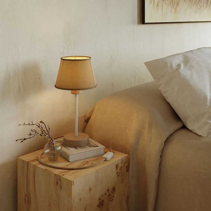 Alzaluce Wood je stolní lampa z bukového dřeva, vybavena šroubovacím úchytem stínidla.