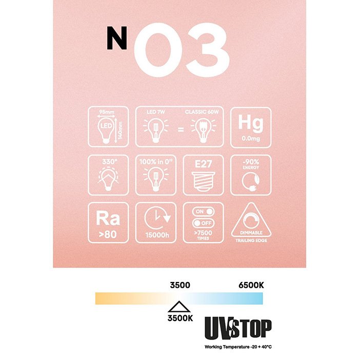 LED žiarovka filament so závitom E27, s čírym sklom tvaru G95 a príkonom 7W je moderné vydanie pre klasické a v minulosti používané žiarovky. Svojím plným okrúhlym tvarom sklenenej banky G95 (Globe - v najširšej časti Ø 95mm) je skvelou alternatívou do všetkých bežných svietidiel s objímkou E27. Číre sfarbenie skla filament žiarovky je vhodné na dosiahnutie veľkého svetelného výkonu bez difúzie svetla o charakteristike: