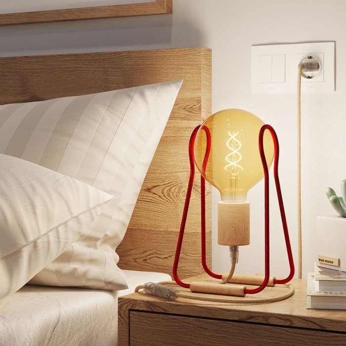 Stojan na lampu Taché slúži na výrobu stolnej lampy. Princíp tohto držiaka stolnej lampy je jednoduchý. Jedná sa o hliníkové drôty opletené textilným káblom ktoré sú k sebe zrkadlovo otočené a spojené elegantnou drevenou nohou. Do voľného priestoru medzi konštrukciu je možné vložiť LED žiarovky typu filament, retro alebo vintage veľkosti G125. K výberu vhodnej žiarovky patrí aj výber vhodnej objímky E27. Dizajn stolnej lampičky pozdvihnú aj textilné káble, ktorými sa objímka pripája k elektrickému napätiu. Na textilný kábel je možné umiestniť šnúrový vypínač a zakončiť ho pomocou zástrčky 230V. Držiak žiarovky je vyrobený MADE in ITALY. Kvalitné spracovanie a jedinečný dizajn retro lampičky odpovedá náročným požiadavkám jedinečný produkt s vysokou mierou individualizácie. Pritom je zostavenie tejto stolnej lampy také jednoduché.