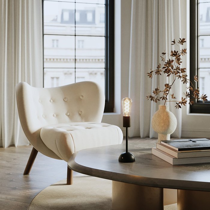 Stolová lampa na batérie Cabless02 so žiarovkou 5V veľkosti ST64 je prenosným svietidlom s mimoriadne univerzálnym použitím. Vyniká kvalitným spracovaním a materiálmi, ktoré prešli dôkladnou selekciou. Naším cieľom bolo stvoriť dokonale modulárne prenosné svetlo s nabíjaním pomocou USB-C. Batéria typu Li-ion 18650 je súčasťou balenia.