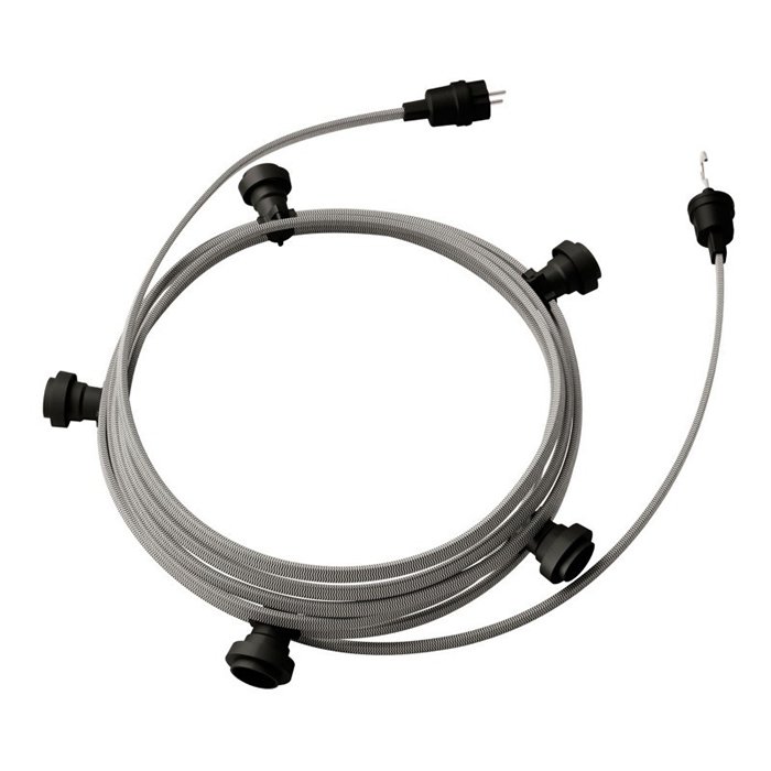 Svetelná reťaz systému Lumet je perfektným spôsobom na osvetlenie vnútorných alebo vonkajších priestorov ako je záhrada, altánok, pergola a ďalšie. Svietiaca reťaz ponúka jedinečný dizajn a mimoriadnu kvalitu použitých komponentov. Vzory plochých textilných káblov a použité farby môžu skvele vystihnúť atmosféru jedinečného momentu pre ktorý bývajú svetelné reťaze použité. Celková dĺžka pre reťaz žiaroviek je 7,5m vrátane 5tich objímok E27 v čiernej farbe a háku pre ľahké zavesenie. Háčik vám tiež umožní krížiť drôty alebo ich viesť paralelne vedľa seba. Ďalšie príslušenstvo pre žiarovkovú reťaz ako sú úchytky na stenu alebo ďalšie doplnkové objímky nájdete tu. Pre ľahké pripojenie k elektrickej sieti je svetelná reťaz vybavená zástrčkou Schuko. Tento produkt spĺňa vyššiu triedu krytia IP44. Možno ho preto označiť za vonkajšiu svetelnú reťaz, ktorú je možné použiť za všetkých poveternostných podmienok.