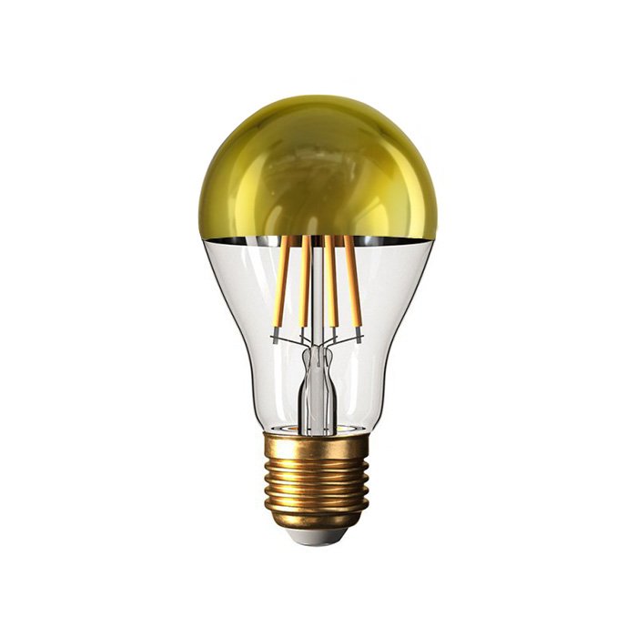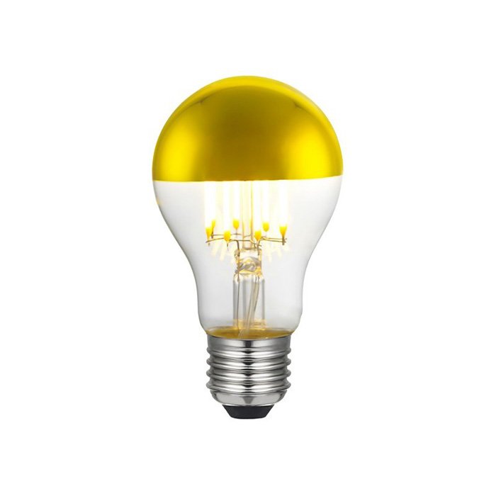 Stmievateľná žiarovka so zrkadlovím vrchlíkom E27 závitu s produktovým označením Dome Gold s príkonom 7W je dekoratívny a energeticky efektívny svetlný zdroj. Vzhľadom k obľúbenému tvaru mliečnej sklenenej banky A60 (Drop - v najširšej časti Ø 60mm) je skvelou alternatívou do všetkých bežných svetiel s objímkou E27. To, čo robí žiarivku Dome Gold mimoriadnym prvkom svetelnej dekorácie je strieborný zrkadlový vrchlík. Zatienený vrchol žiarovky spôsobuje, že produkované svetlo preniká do prestoru iba skrz číry sklenený obvod žiarovky. Stmievateľná žiarovka A60 s nesmerovým vyžarovaním svetla slúži pre neoslňujúce svetelné efekty a má svetelné charakteristiky: