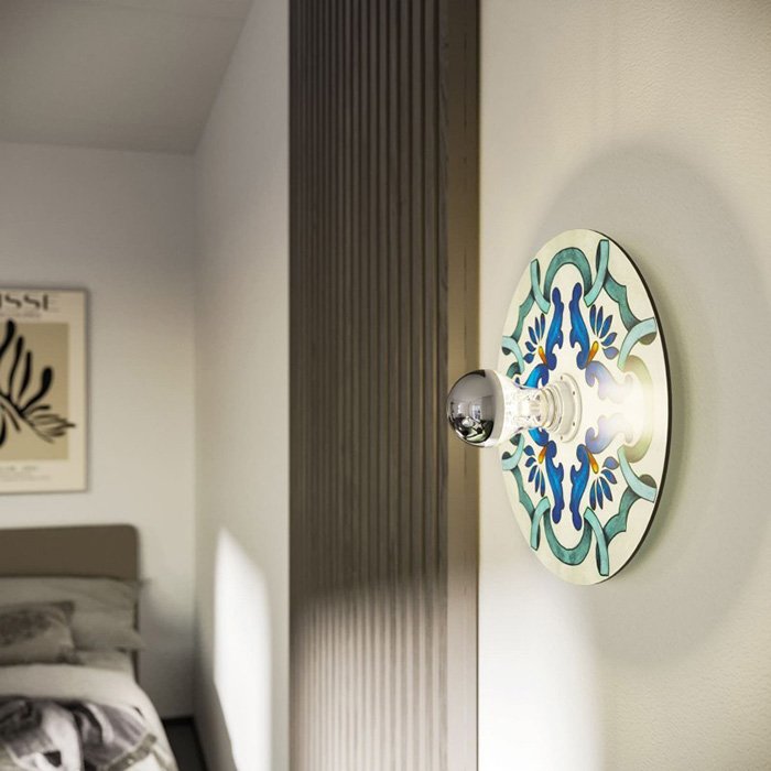 Nástenná alebo stropná lampa s majolikovým tienidlom je spojená so striebornou pologuľovou žiarovkou, ktorá vyžaruje teplé a rozptýlené svetlo pre upokojujúcu atmosféru. Svetlo sa rovnomerne šíri vďaka nádhernému tienidlu.