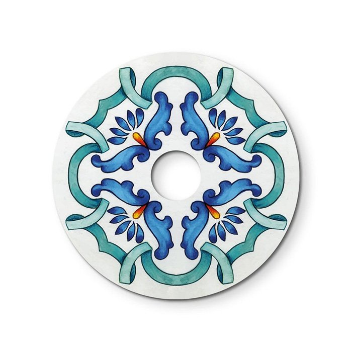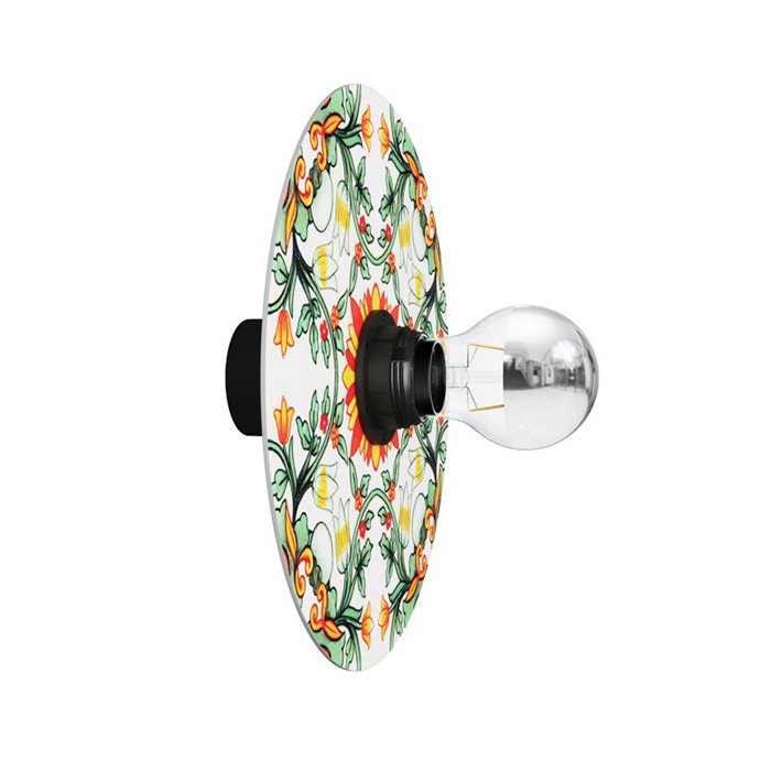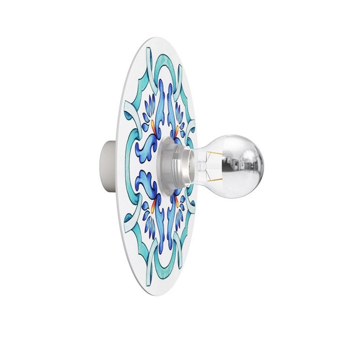 Toto nástenné alebo stropné svietidlo s majolikovým tienidlom je dôkazom, že osvetlenie môže byť funkčné aj dekoratívne: kombinuje vycibrenú estetiku tienidla s jednoduchým a lineárnym dizajnom držiaka svietidla. Všestranné a minimalistické riešenie, ktoré sa vďaka držiaku lampy, ktorý je možné namontovať priamo na stenu bez ružice, prispôsobí mnohým rôznym prostrediam. Podľa nášho názoru je pre túto kompozíciu ideálna žiarovka A60 so striebornou pologuľou na kopulu: ideálna voľba pre zvýraznenie vzorov na tienidle, pre prívetivé a zároveň výrazné osvetlenie.