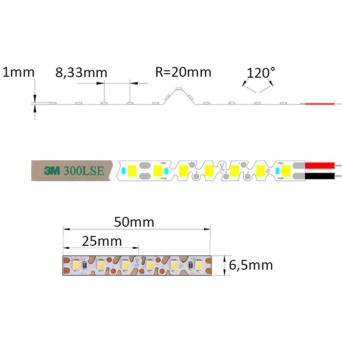 12V LED pásik s označením SC12120 je postavený na tlačenom spoji PCB (Printed Circuit Board) so šírkou 6,5mm, deliteľnosťou každých 2,5cm a podielom medi 2OZ.